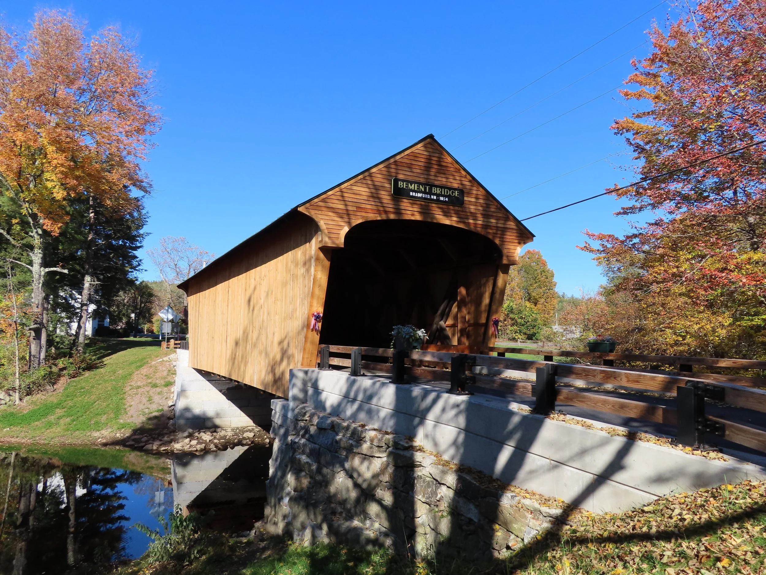 For this award-winning project, we completed the rehabilitation of the Bement Covered Bridge which carries Center Road over the West Branch Warner River in Bradford, NH. This project included full replacement of the lower chord and deck, installation of new floor beams, replacing the deteriorated bridge truss members, siding replacement, new timber approach railing supported by cast-in-place concrete moment slabs, complete replacement of the north abutment with a new dry laid stone abutment and approach roadway reconstruction.